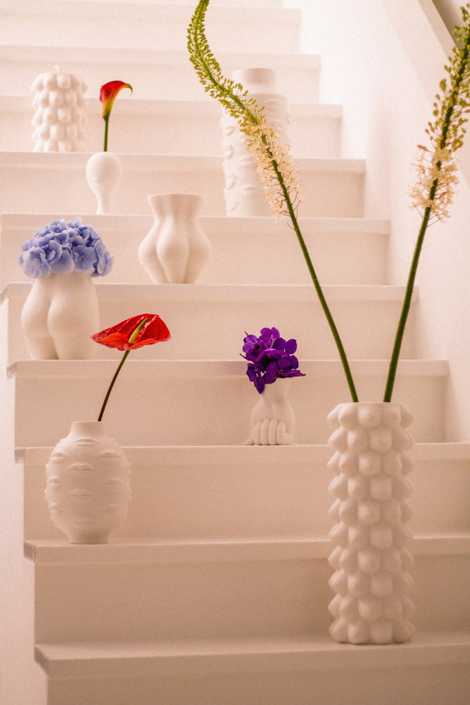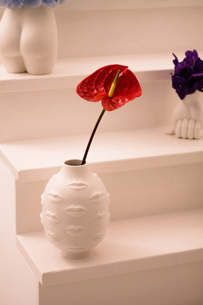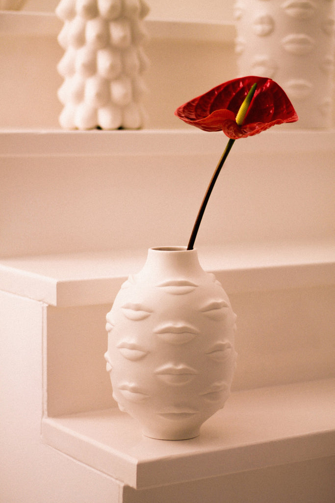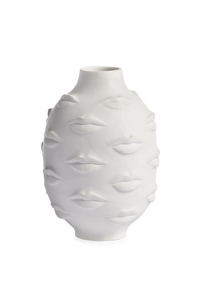 An expressive collection of moody mouths wrap a vessel crafted from high-fired unglazed porcelain. A kiss of cool for your table, mantel, or shelf. Inspired by Gala, wife and muse of surrealist painter and printmaker, Salvador Dalí.