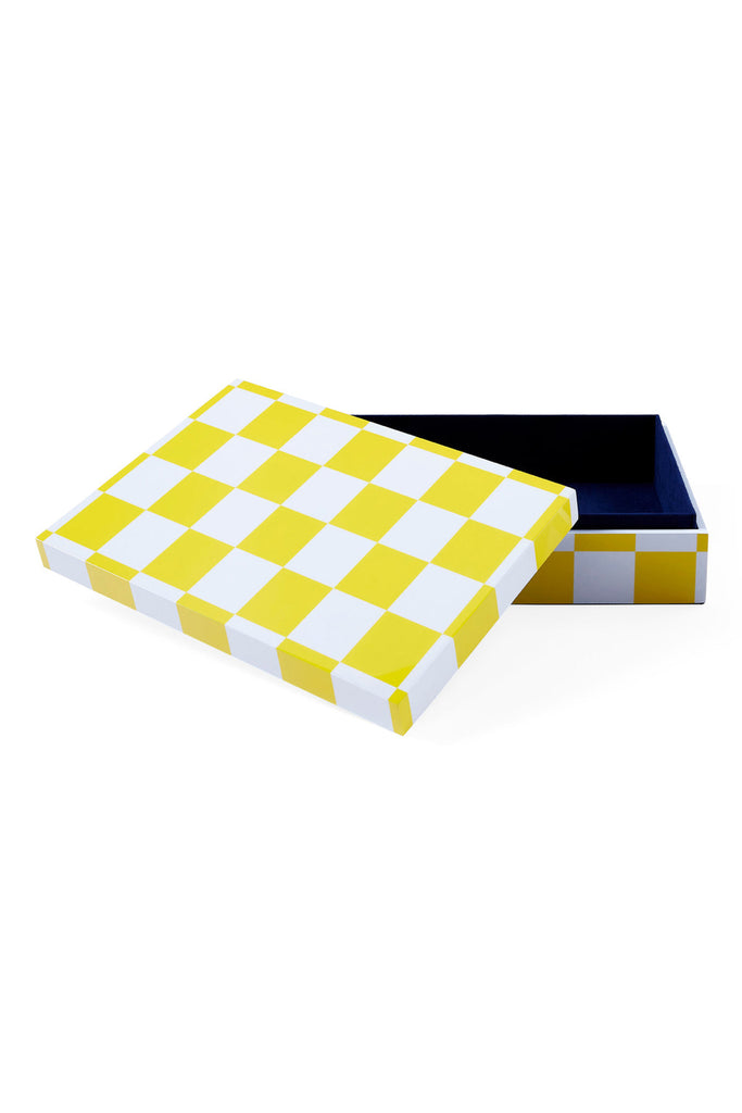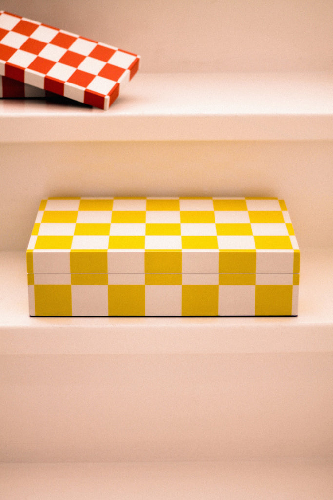 Three hot hues give this classic pattern a modern (and memorable) makeover. The bright, bold, high-gloss and hand-finished Checkerboard lacquer stacking boxes are poppy addition to your shelf, mantel, or tablescape. Available in three sizes for stashing, stacking, or making a stand-alone statement.