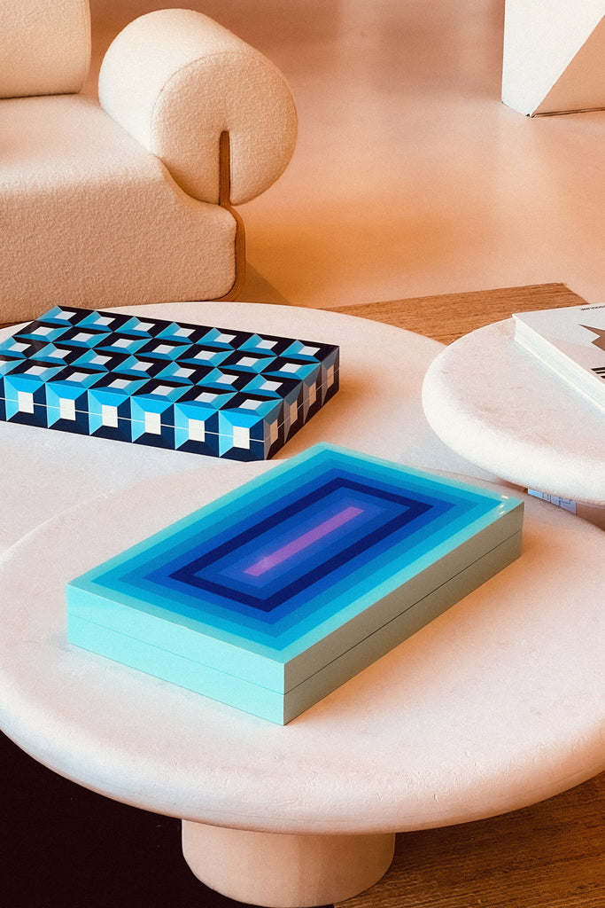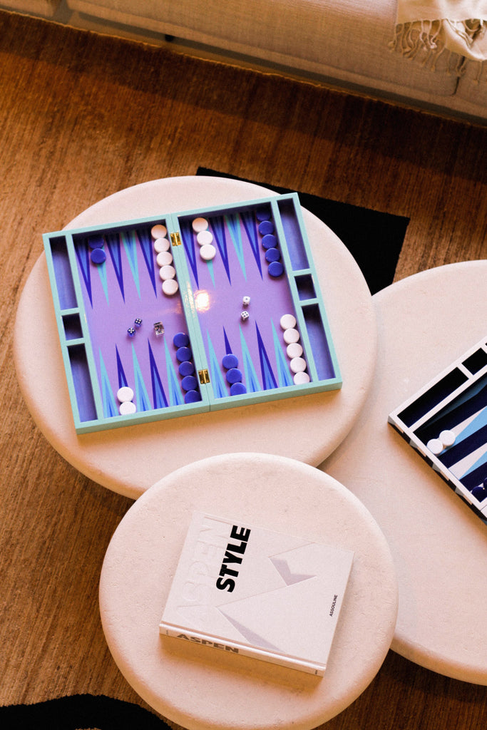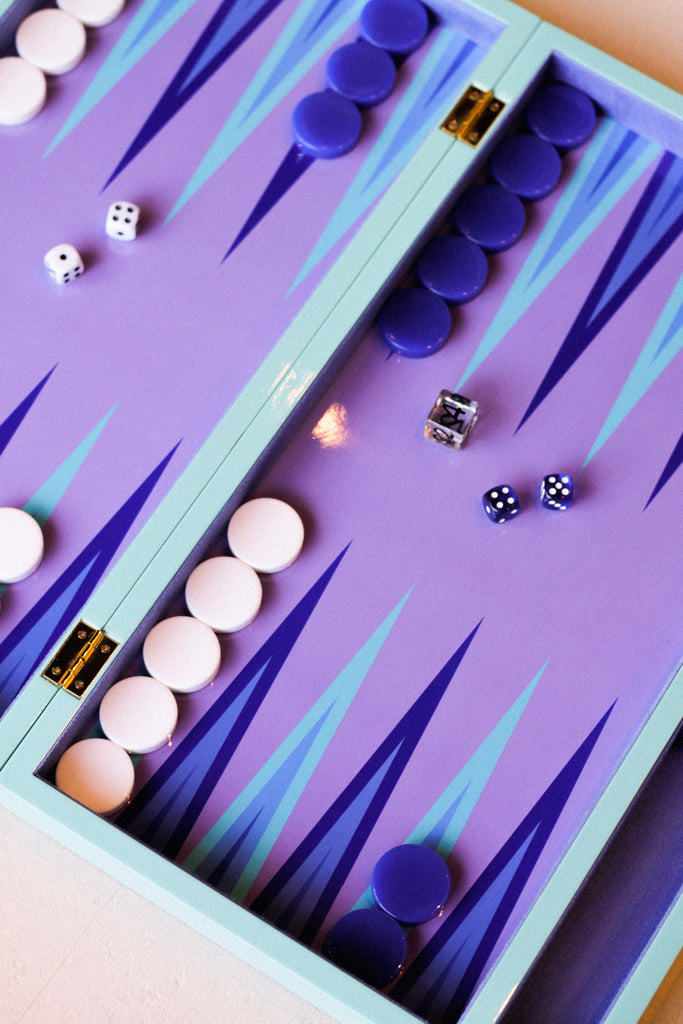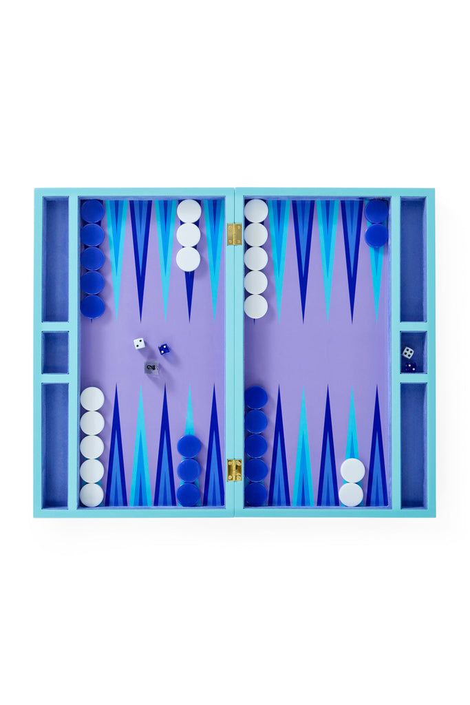 Crafted in couture lacquer and featuring 60s inspired concentric squares in cool blues and shades of lavender, the Scala Backgammon Set is the mod moment your game night needs. After vanquishing your foes, fold it closed for a cool cocktail table accent.