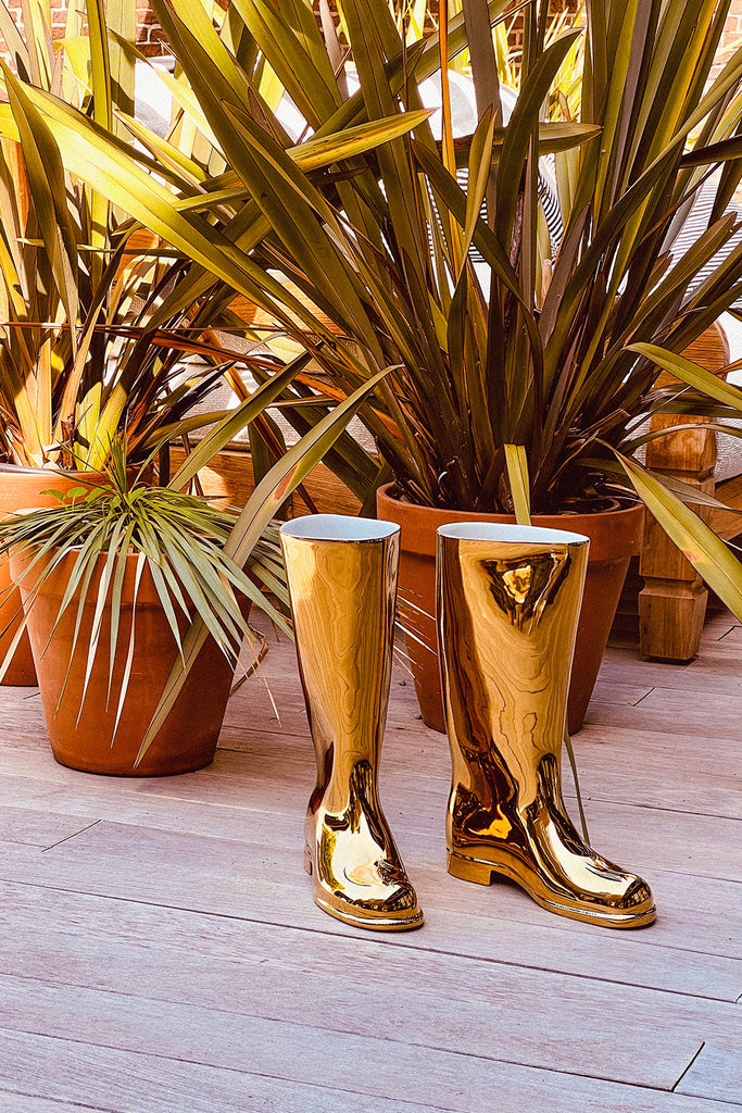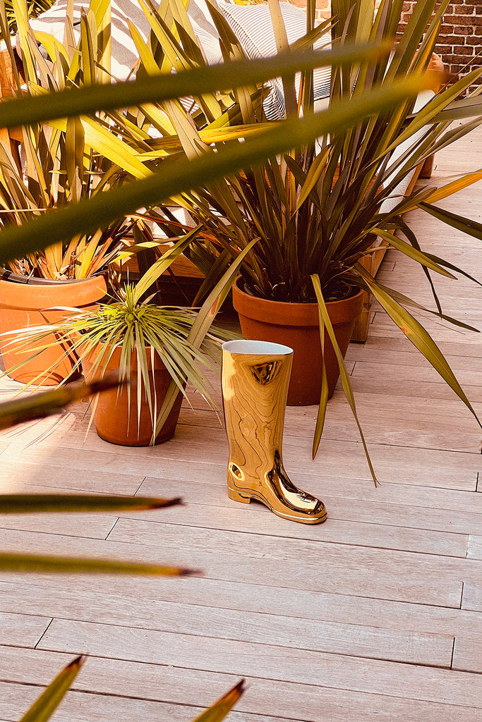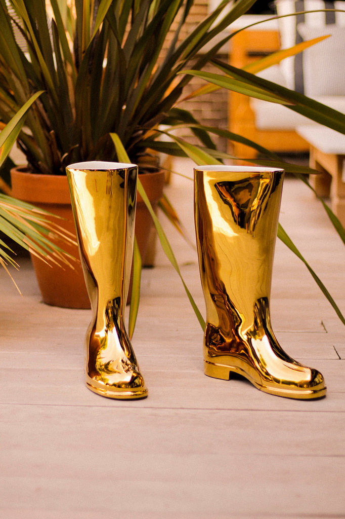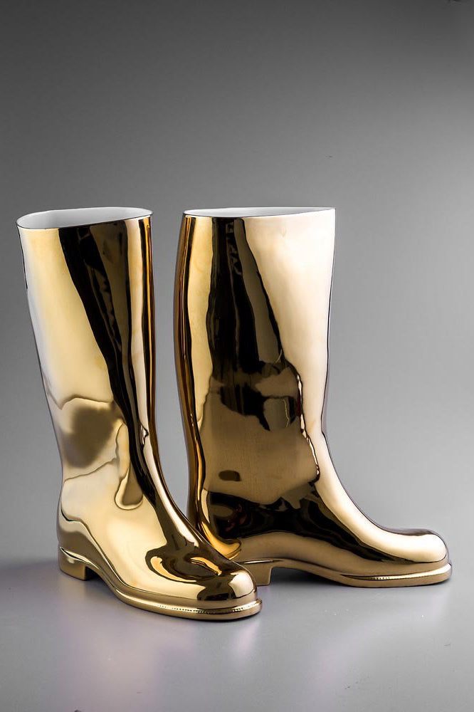Vase in the shape of a rubber boot, originally white, later expanded in many color variants, starting with onion decor and other, mainly metal-plated variants.