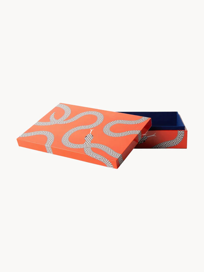 Featuring slithering serpents on a high-gloss poppy orange backdrop, our hand-finished, high-gloss Eden Lacquer Boxes are a chic and charming addition to your shelf, mantel, or tablescape. Keep your possessions handy but hidden. Available in three sizes for stashing, stacking, or making a stand-alone statement.