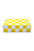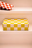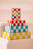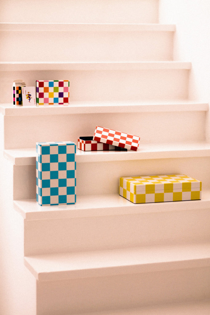Three hot hues give this classic pattern a modern (and memorable) makeover. The bright, bold, high-gloss and hand-finished Checkerboard lacquer stacking boxes are poppy addition to your shelf, mantel, or tablescape. Available in three sizes for stashing, stacking, or making a stand-alone statement.